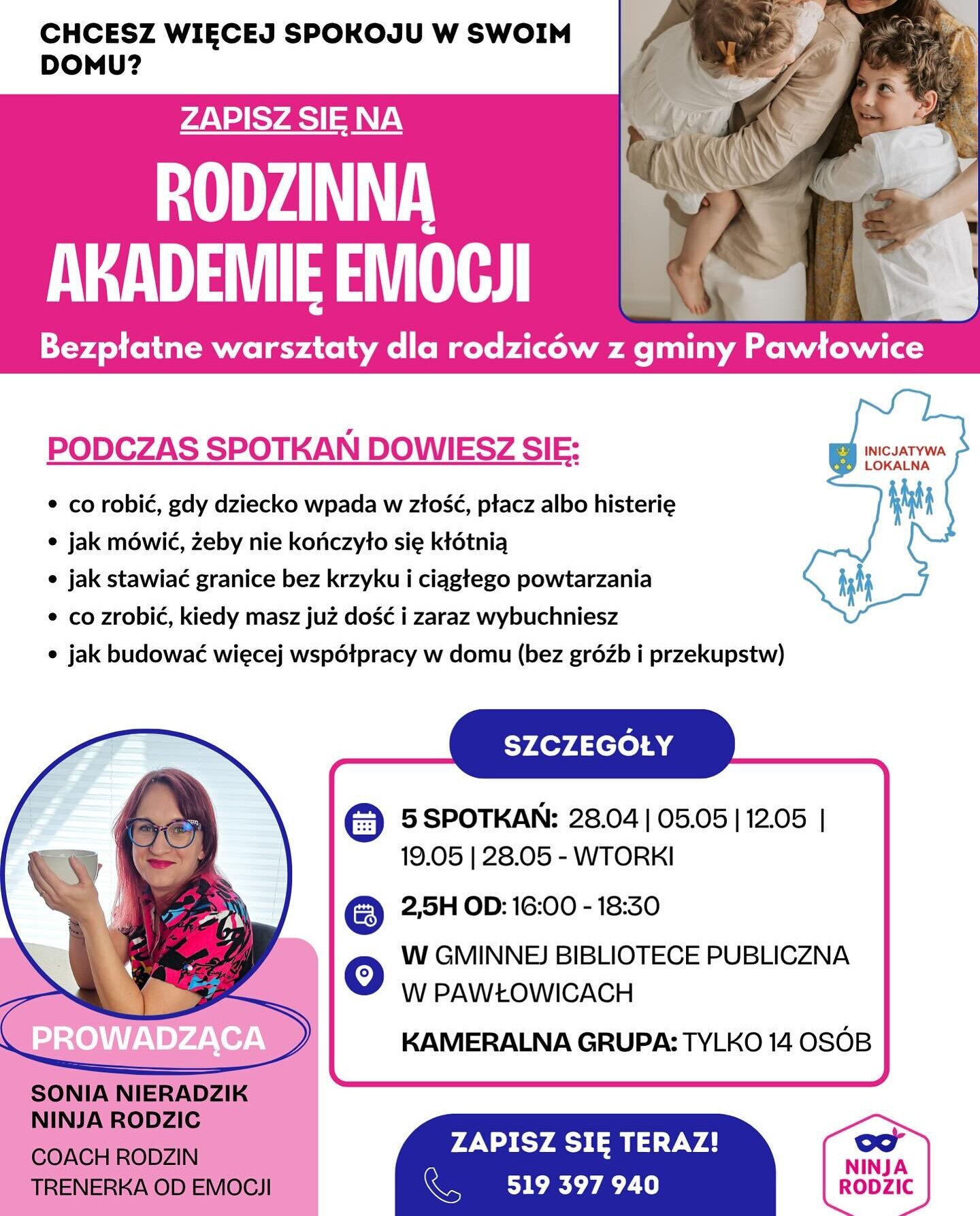 Zapraszamy rodziców do udziału w cyklu spotkań „Rodzinna Akademia Emocji” – praktycznych warsztatów, które pomogą lepiej radzić sobie z emocjami w codziennym życiu rodzinnym.