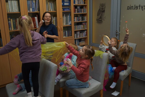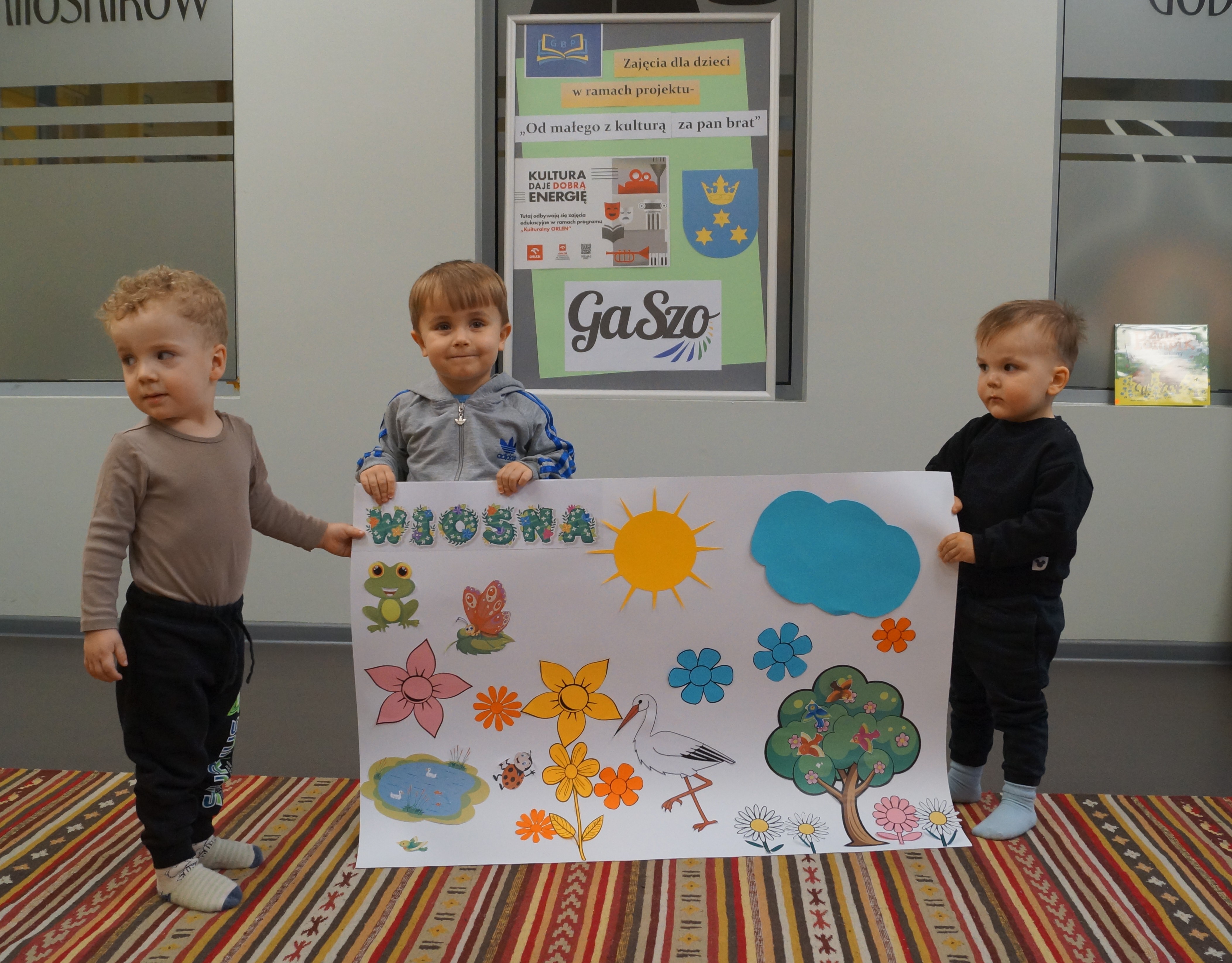 9 i 10 marca odbyły się kolejne zajęcia w ramach projektu „Od małego z kulturą za pan brat”, na których zawitała już wiosna! Podczas zajęć muzycznych, do wspólnej, wesołej zabawy dzieci wykorzystały wybrane przez siebie instrumenty. Natomiast na zajęciach czytelniczych oprócz wysłuchania historyjki o odważnej Sowie, oraz przejrzeniu innych ciekawych książeczek, wykonały wspólną wiosenną pracę plastyczną.