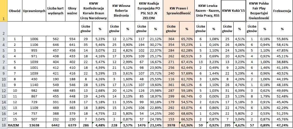 Frekwencja w wyborach wyniosła 47,24 %. Na 13638 uprawnionych do głosowania oddano 6379 ważnych głosów. Największe poparcie uzyskało Prawo i Sprawiedliwość, na które zagłosowało 3978 osób (62,36%). Na drugim miejscu znalazła się KKW Koalicja Europejska PO PSL SLD .N ZIELONI z wynikiem 1476 głosów (23,14 %), a na trzecim KWW Kukiz'15 z wynikiem 295 głosów (4,62%). Szczegółowe wyniki znajdują się poniżej.